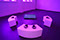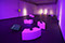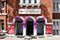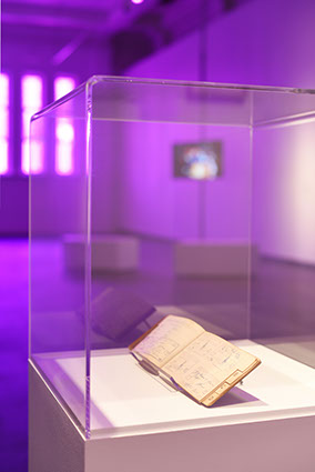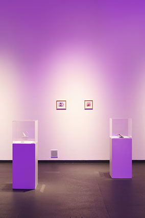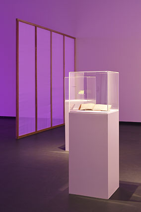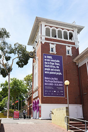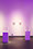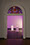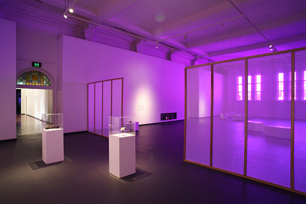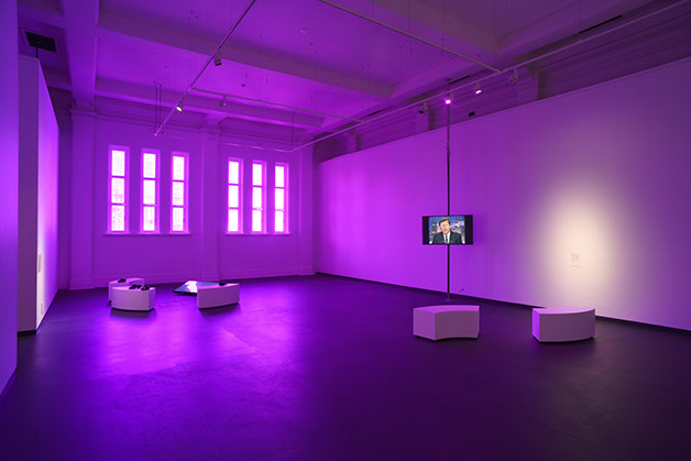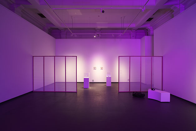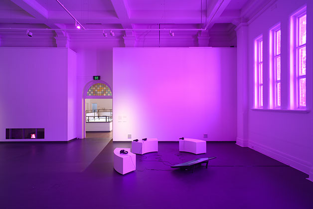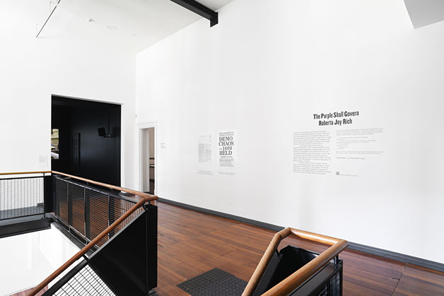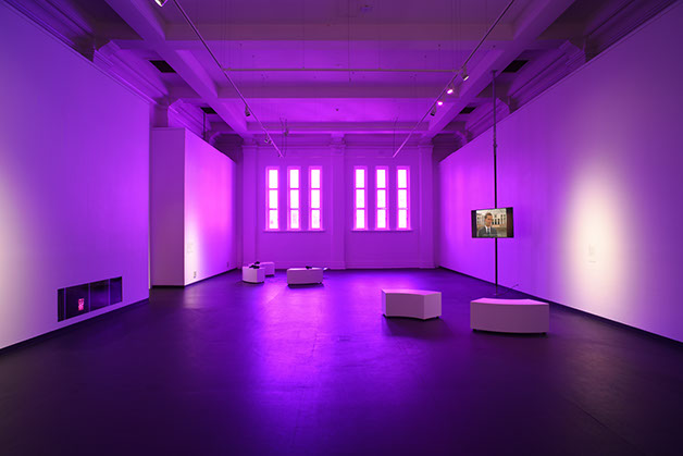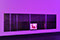 Installation view of The Purple Shall Govern, 2022. 18 windows with 797 'Deep Purple' lighting gel. Purple light can be seen permeating from this work throughout the exhibition. West End Gallery, PICA.