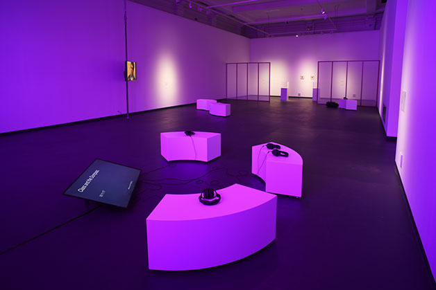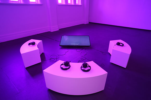 Installation view of Lunch with the family at Mignon Street, Cape Town, 2022. Audio-video installation with headphones, flat screen monitor, single channel high definition video, fabricated seating. Duration 36:33, West End Gallery, PICA.