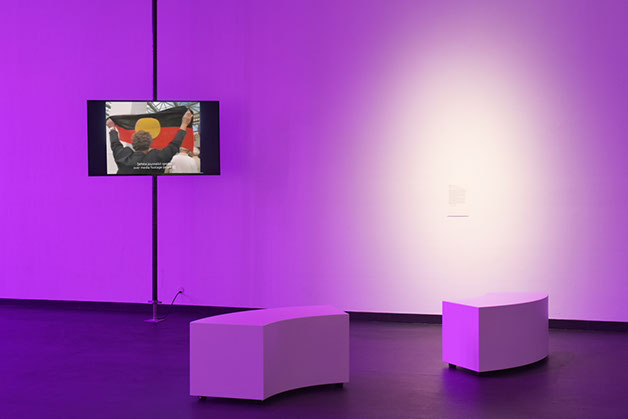 Installation view of Though buried, They echo, 2022. Video installation with perspex in gallery wall, broadcast monitor and single channel standard definition video. Duration: 3:59, West End Gallery, PICA.