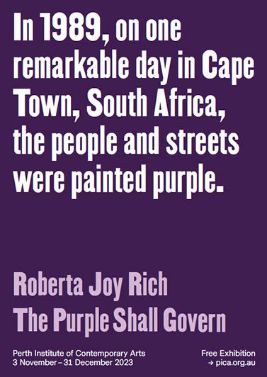Naarm (Melbourne) based artist Roberta Joy Rich takes the transformative Purple Rain Protest as the basis for her solo exhibition, The Purple Shall Govern at PICA. Juxtaposing the harsh histories of segregation in settler nation South Africa and Australia, Rich interrogates who has access to public space – then and now.